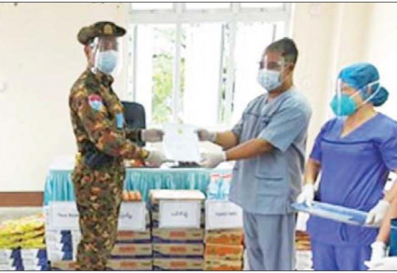 လက်ရှိအချိန်တွင် ကိုဗစ်-၁၉ ရောဂါတတိယလှိုင်းဖြစ်ပွားမှု မြင့်တက်လျက်ရှိပြီး ဓာတ်ခွဲအတည်ပြုပိုး တွေ့လူနာများနှင့် သီးသန့်စောင့်ကြည့် ရမည့်သူများကို တပ်မတော်ဆေးရုံများ၊ ပြည်သူ့ဆေးရုံများ၊ ကျန်းမာရေး ဌာနများနှင့် ကိုဗစ်စင်တာများတွင် ကျန်းမာရေးစောင့်ရှောက်မှုလုပ်ငန်း များကို တပ်မတော်သားဆရာဝန်များ၊ ကျန်းမာရေးဝန်ထမ်းများ၊ လူမှုရေးအသင်းအဖွဲ့များ ပူးပေါင်း၍ အင်တိုက်အားတိုက် ဆောင်ရွက် ပေးလျက်ရှိ၍ ထိုသို့ဆောင်ရွက်ပေးရာတွင် အထောက်အကူဖြစ်စေရန် အတွက် ကာကွယ်၊ ထိန်းချုပ်၊ ကုသရေးပစ္စည်းများ၊ အောက်ဆီဂျင်အိုး များနှင့် အာဟာရဖြည့် စားသောက်ဖွယ်ရာများကို တပ်မတော်က သွားရောက်ထောက်ပံ့ လှူဒါန်းပေးလျက်ရှိသည်။