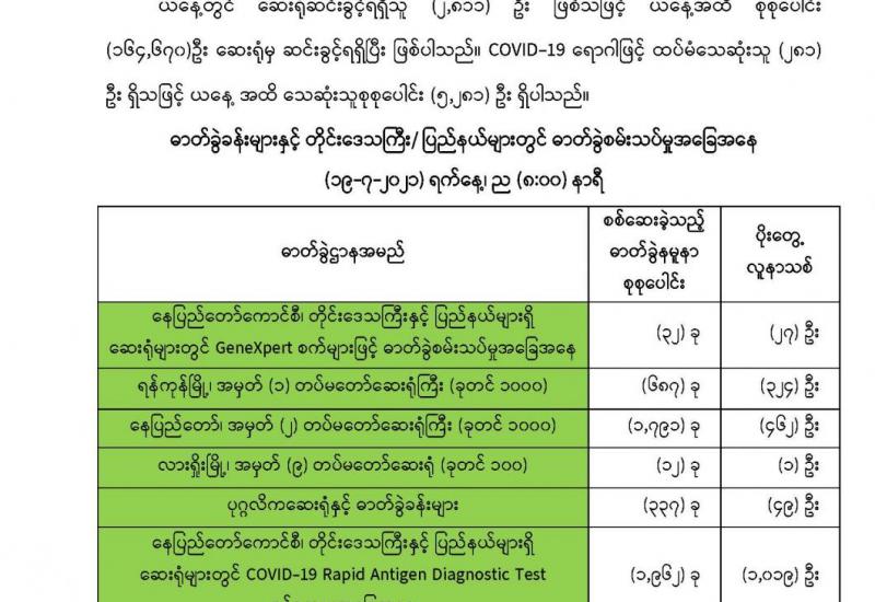 လက်ရှိအချိန်တွင် ကိုဗစ်-၁၉ ရောဂါ တတိယလှိုင်းဖြစ်ပွားမှု မြင့်တက်လျက်ရှိပြီး ဓာတ်ခွဲအတည်ပြု ပိုးတွေ့လူနာများနှင့် သီးသန့်စောင့်ကြည့်ရမည့်သူများကို တပ်မတော်ဆေးရုံများ၊ ပြည်သူ့ဆေးရုံများ၊ ကျန်းမာရေးဌာနများနှင့် ကိုဗစ်စင်တာများတွင် ကျန်းမာရေးစောင့်ရှောက်မှု လုပ်ငန်းများကို တပ်မတော်သား ဆရာဝန်များ၊ ကျန်းမာရေးဝန်ထမ်းများ၊ လူမှုရေးအသင်းအဖွဲ့များ ပူးပေါင်း၍ အင်တိုက်အားတိုက် ဆောင်ရွက်ပေးလျက်ရှိပြီး ထိုသို့ဆောင်ရွက်ပေးရာတွင် အထောက်အကူဖြစ်စေရန် အတွက် ကာကွယ်၊ ထိန်းချုပ်၊ ကုသရေးပစ္စည်းများ၊ အောက်ဆီဂျင်အိုးများနှင့် အာဟာရဖြည့် စားသောက်ဖွယ်ရာများကို တပ်မတော်က သွားရောက်ထောက်ပံ့လှူဒါန်းပေးလျက်ရှိသည်။
