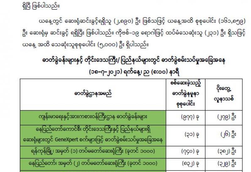 ကိုဗစ်-၁၉ ရောဂါ ဓာတ်ခွဲ အတည်ပြု ပိုးတွေ့လူနာများကို ကုသရေးလုပ်ငန်းများ ဆောင်ရွက် ရာတွင် တိုင်းဒေသကြီးနှင့် ပြည်နယ်အသီးသီး၌ အောက်ဆီဂျင်လိုအပ်ချက်များ မရှိစေရေး အတွက် ကျန်းမာရေးနှင့် အားကစားဝန်ကြီးဌာနမှ Oxygen Plant များကို တိုးမြှင့်တပ်ဆင် လည်ပတ်လျက်ရှိပြီး တပ်မတော် အနေဖြင့်လည်း တိုင်းစစ်ဌာနချုပ် နယ်မြေအသီးသီးတွင် Oxygen Plant များ တပ်ဆင်ထုတ်လုပ်ကာ ပြည်သူ့ဆေးရုံများနှင့် ကိုဗစ် ကုသရေးစင်တာ များသို့ ပို့ဆောင် ဖြန့်ဝေ လှူဒါန်းလျက်ရှိသည်။