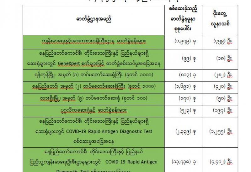 (၁၃-၇-၂၀၂၁) ရက်နေ့၊ ည (၈:၀၀) နာရီမှ (၁၄-၇-၂၀၂၁) ရက်နေ့၊ ည (၈:၀၀) နာရီအတွင်း ဓာတ်ခွဲနမူနာစုစုပေါင်း (၂၁,၃၅၂) ခုအား စစ်ဆေးပြီးစီးခဲ့ရာ COVID-19 ရောဂါ ဓာတ်ခွဲအတည်ပြု လူနာ သစ် (၇,၀၈၃) ဦး တွေ့ရှိရပါသည်။ သို့ဖြစ်ပါ၍ ယနေ့အထိ ဓာတ်ခွဲနမူနာ စုစုပေါင်း (၂,၉၁၄,၂၈၄) ခု အား စစ်ဆေးခဲ့ပြီး COVID-19 ဓာတ်ခွဲအတည်ပြုလူနာ စုစုပေါင်း (၂၀၈,၃၅၇) ဦး ရှိပြီ ဖြစ်ပါသည်။