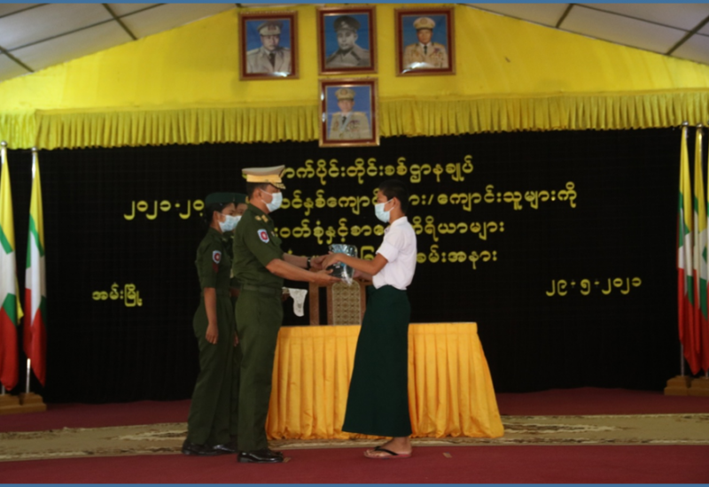 အနောက်ပိုင်း တိုင်းစစ်ဌာနချုပ်၌ ၂၀၂၁-၂၀၂၂ ပညာသင်နှစ် ကျောင်းသား/ ကျောင်းသူများအား ကျောင်းဝတ်စုံနှင့် စာရေးကိရိယာများ ထောက်ပံ့ပေးအပ်ပွဲကို ယနေ့နေ့လယ်ပိုင်းတွင် တိုင်းစစ်ဌာနချုပ်၊ အမ်းတောင်ခန်းမ၌ ပြုလုပ်ရာ တိုင်းမှူး ဗိုလ်ချုပ် ထင်လတ်ဦးနှင့် အဖွဲ့ဝင်များ၊ အရာရှိ၊ စစ်သည်များ၊ ဆရာ၊ ဆရာမများ၊ ကျောင်းသား မိဘများနှင့် ကျောင်းသား/ကျောင်းသူများ တက်ရောက်ကြသည်။
