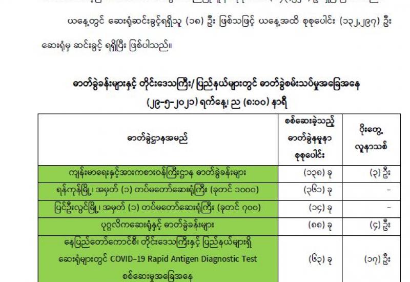 ကျန်းမာရေးနှင့် အားကစားဝန်ကြီးဌာနက မေလ၂၆ ရက်နေ့ ည ၈ နာရီမှ မေလ ၂၇ ရက်နေ့ည ၈ နာရီအတွင်း တစ်ရက်တာ ဓာတ်ခွဲနမူနှာ စုစုပေါင်း ၁၇၈၈ ခုအား စစ်ဆေးပြီးစီးမှုအရ ကိုဗစ်-၁၉ ရောဂါ ဓာတ်ခွဲအတည်ပြု လူနာသစ် ၉၆ ဦး တွေ့ရှိခဲ့ရသည်။ မေလ ၂၇ ရက်နေ့ ည ၈ နာရီမှ ၂၈ ရက်နေ့ ည ၈ နာရီအတွင်း တစ်ရက်တာ ဓာတ်ခွဲနမူနာ ၁၂၃၀ ကို စစ်ဆေးမှုအရ ရောဂါကူးစက်ခံရသူ ၇၂ ဦး ထပ်မံတွေ့ရှိခဲ့သည်။