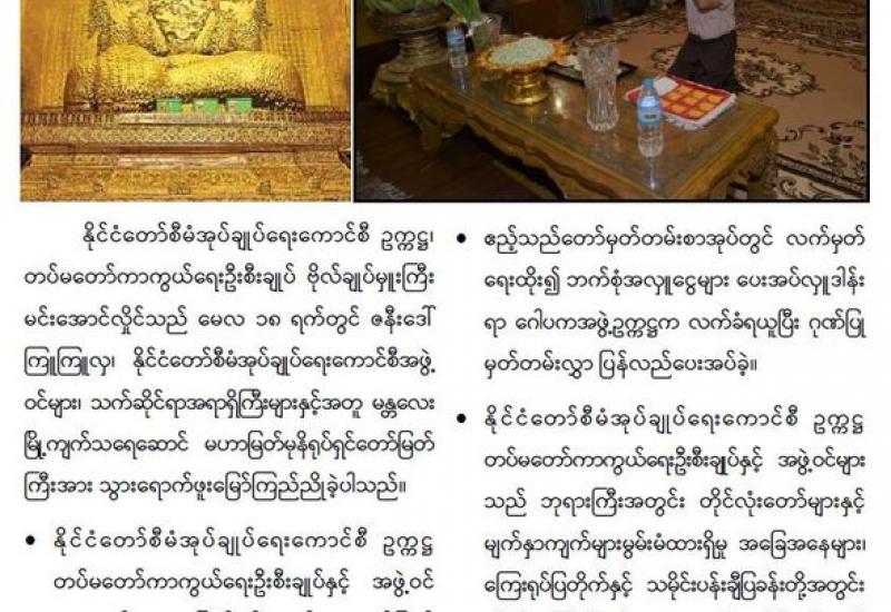 ဗုဒ္ဓဘာသာမြန်မာလူမျိုးတို့၏ ၁၂ လရာသီပွဲတော်တွင် တစ်ခုအပါအဝင်ဖြစ်သည့် မြန်မာသက္ကရာဇ် ၁၃၈၃ ခုနှစ်၊ ကဆုန်လပြည့်ဗုဒ္ဓနေ့ဖြစ်သော ယနေ့တွင်ကျရောက်သည့် ကဆုန်ညောင်ရေသွန်းပွဲတော်တွင် နေပြည်တော်၊ ဥပ္ပါတ သန္တိစေတီတော်မြတ်ကြီး ပရိဝုဏ်တော်မြောက်ဘက်အရပ်ရှိ မဟာဗောဓိညောင်ပင်တော်များအား (၁၃)ကြိမ် မြောက် ကဆုန်ညောင်ရေသွန်းလောင်း ပူဇော်ခြင်း မဟာမင်္ဂလာအခမ်းအနားအား ယနေ့ညနေပိုင်း၌ ကျင်းပပြုလုပ်ရာ နိုင်ငံတော်စီမံအုပ်ချုပ်ရေးကောင်စီဥက္ကဋ္ဌ တပ်မတော်ကာကွယ်ရေး ဦးစီးချုပ် ဗိုလ်ချုပ်မှူးကြီး မင်းအောင်လှိုင်နှင့်ဇနီး ဒေါ်ကြူကြူလှတို့က မဟာဗောဓိ ညောင်ပင်များကို ညောင်ရေသွန်း လောင်း ပူဇော်ကြ သည်။