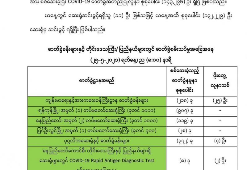 ပြည်သူလူထု၏ ခွဲစိတ်ကုသမှုဆိုင်ရာရောဂါ၊ သွားနှင့်ခံတွင်းရောဂါ၊ အရိုးအကြောရောဂါ၊ အစာအိမ် ရောဂါ၊ မျက်စိရောဂါ၊ နား၊နှာခေါင်း၊ လည်ချောင်း ရောဂါ၊ သားဖွားမီးယပ်ရောဂါ၊ သွေးတိုးရောဂါ၊ နှလုံးရောဂါ၊ အထွေထွေရောဂါတို့နှင့် ပတ်သက်၍ လိုအပ်သည့် ကျန်းမာရေး စောင့်ရှောက်မှု လုပ်ငန်းများ ဆောင်ရွက်ပေး နိုင်ရန်အတွက် အခက်အခဲဖြစ်ပေါ်လျက်ရှိသည့် ဒေသအသီးသီးမှ ဝန်ထမ်းများနှင့် ဒေသခံများ၏ တောင်းဆိုမှုအရ တပ်မတော်မှ ဆေးကုသရေးအဖွဲ့များ စေလွှတ်၍ ဆေးကုသရေး လုပ်ငန်းများကို ဆောင်ရွက်ပေးလျက်ရှိသည်။
