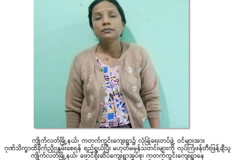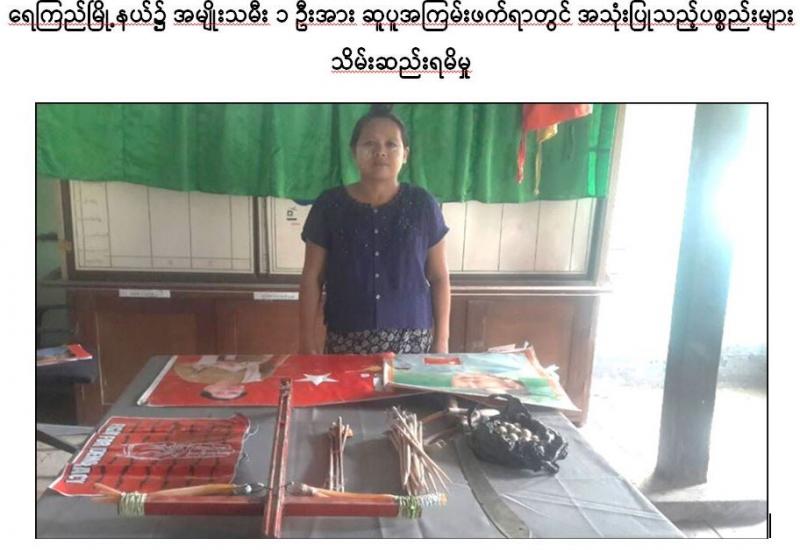 လုံခြုံရေးတပ်ဖွဲ့ဝင်များသည် ဆူပူအကြမ်းဖက်မှုလုပ်ရပ်များတွင် အသုံးပြုမည့် လက်နက်၊ ပစ္စည်း၊ ကိရိယာများအား ပြုလုပ်သူ၊ လက်ဝယ်ထားရှိသူများအား ဆက်လက်ဖော်ထုတ်ထိန်းသိမ်း လျက်ရှိရာ မေလ ၂၂ ရက် မွန်းလွဲ ၂ နာရီခွဲခန့် တွင် ဧရာဝတီတိုင်းဒေသကြီး၊ ရေကြည်မြို့နယ်၊ အသုတ်မြို့ (၅)ရပ်ကွက်နေ ဦးမြဦး(စိစစ်ဆဲ)၏ နေအိမ်သို့ လုံခြုံရေးတပ်ဖွဲ့ဝင်များက သတင်းအရ ဝင်ရောက် ရှာဖွေရာ ဦးမြဦး၏ ဇနီးဖြစ်သူ ဒေါ်မြတ်မွန်ကြူ(ခ)ခင်နှင်းသက်(၅၀)နှစ် (ဘ)ဦးကိုသန်း အား တွေ့ရှိထိန်းသိမ်းပြီး နေအိမ်အတွင်းမှ ဆူပူအကြမ်းဖက်ရာတွင် အသုံးပြုသည့် နိုင်ငံတော် ဆန့်ကျင်ရေးစာသားပါ ဗီနိုင်း ၃ ခု၊ ဓားရှည် ၁ ချောင်း၊ သံပိုက်ဖြင့် ပြုလုပ်ထားသည့် ဒူးလေး ၁ လက်၊ မြှားတံ ၂၅ ချောင်းတို့အား သိမ်းဆည်းရမိခဲ့သည်။