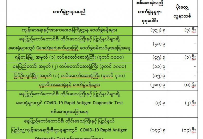 (၂၃-၅-၂၀၂၁) ရက်နေ့၊ ည (၈:၀၀) နာရီမှ (၂၄-၅-၂၀၂၁) ရက်နေ့၊ ည (၈:၀၀) နာရီအတွင်း ဓာတ်ခွဲနမူနာစုစုပေါင်း (၈၇၉) ခုအား စစ်ဆေးပြီးစီးခဲ့ရာ COVID-19 ရောဂါ ဓာတ်ခွဲအတည်ပြု လူနာသစ် (၂၈) ဦး တွေ့ရှိရပါသည်။ သို့ဖြစ်ပါ၍ ယနေ့အထိ ဓာတ်ခွဲနမူနာ စုစုပေါင်း (၂,၆၁၁,၆၂၆) ခု အား စစ်ဆေးခဲ့ပြီး COVID-19 ဓာတ်ခွဲအတည်ပြုလူနာ စုစုပေါင်း (၁၄၃,၂၆၂) ဦး ရှိပြီ ဖြစ်ပါသည်။