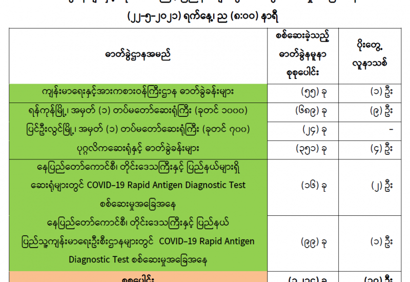 (၂၁-၅-၂၀၂၁) ရက်နေ့၊ ည (၈:၀၀) နာရီမှ (၂၂-၅-၂၀၂၁) ရက်နေ့၊ ည (၈:၀၀) နာရီအတွင်း ဓာတ်ခွဲနမူနာစုစုပေါင်း (၁,၂၃၄) ခုအား စစ်ဆေးပြီးစီးခဲ့ရာ COVID-19 ရောဂါ ဓာတ်ခွဲအတည်ပြု လူနာသစ် (၁၇) ဦး တွေ့ရှိရပါသည်။ သို့ဖြစ်ပါ၍ ယနေ့အထိ ဓာတ်ခွဲနမူနာ စုစုပေါင်း (၂,၆၁၀,၀၆၉) ခု အား စစ်ဆေးခဲ့ပြီး COVID-19 ဓာတ်ခွဲအတည်ပြုလူနာ စုစုပေါင်း (၁၄၃,၂၂၈) ဦး ရှိပြီ ဖြစ်ပါသည်။