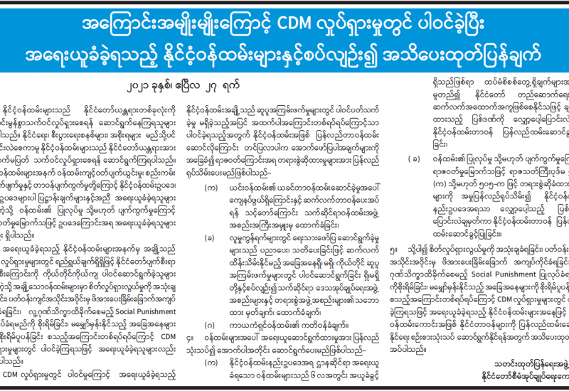 တိုင်းဒေသကြီးနှင့်ပြည်နယ်အချို့တွင် CDM လှုပ်ရှားမှုကို အခြေခံပြီး ရပ်ရွာ အေးချမ်းသာယာရေးနှင့် တရားဥပဒေစိုးမိုးမှုအား ပျက်ပြားစေရန် ရည်ရွယ်ချက်ဖြင့် အကြမ်းဖက်မှုများကို ဦးတည်စေသော ဆူပူဆန္ဒပြမှုများအား သွေးထိုးလှုံ့ဆော် လျက်ရှိသောကြောင့် အုပ်ချုပ်ရေးအဖွဲ့အစည်းများနှင့် လုံခြုံရေးအဖွဲ့အစည်းများက ဥပဒေနှင့်အညီ ပူးပေါင်းထိန်းသိမ်းဆောင်ရွက်လျက်ရှိသည်။