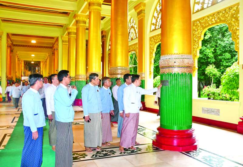 သာသနာရေးနှင့်ယဉ်ကျေးမှုဝန်ကြီးဌာန ဒုတိယဝန်ကြီး ဦးအေးထွန်းသည် တာဝန်ရှိသူများနှင့်အတူ ယနေ့နံနက်ပိုင်းတွင် ရန်ကုန်မြို့ ရွှေတိဂုံစေတီတော်မြတ်ကြီးရှိ တန်ဆောင်းများမွမ်းမံပြီးစီးမှု အခြေအနေကို ကြည့်ရှုစစ်ဆေးသည်။