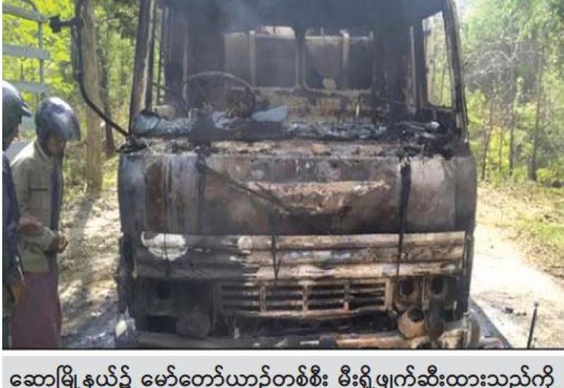 မကွေးတိုင်းဒေသကြီး၊ ဆောမြို့နယ်၌ မေ ၁၃ ရက်တွင် အကြမ်းဖက်သူများက မီးရှို့ဖျက်ဆီး၍ မော်တော်ယာဉ် ၁ စီးမီးလောင်ပျက်စီးကာ ယာဉ်မောင်းနှင့် ယာဉ်နောက် လိုက်တို့ သေဆုံး ခဲ့ကြောင်း သိရသည်။