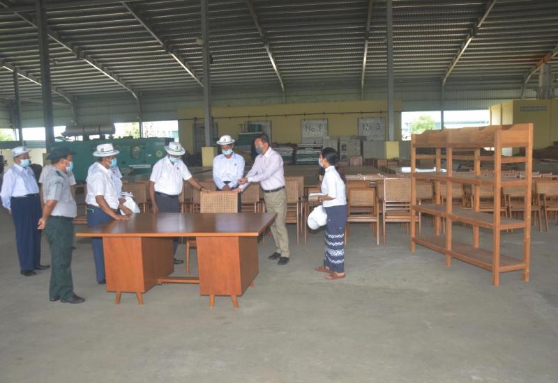 သယံဇာတနှင့် သဘာဝပတ်ဝန်းကျင်ထိန်းသိမ်းရေးဝန်ကြီးဌာန၊ ပြည်ထောင်စု ဝန်ကြီး ဦးခင်မောင်ရီသည် တာဝန်ရှိ သူများနှင့်အတူ ယနေ့တွင် ရန်ကုန်တိုင်းဒေသကြီး၊ တောင်ဒဂုံမြို့နယ်ရှိ မြန်မာ့သစ်လုပ်ငန်း၊ သစ်အခြေခံ စက်မှု လုပ်ငန်းဌာန၊ အမှတ်(၁၀) ပရိဘောဂစက်ရုံအား ကြည့်ရှုစစ်ဆေးရာ သစ်အခြေခံစက်မှုလုပ်ငန်းဌာန စက်ရုံအထွေထွေ မန်နေဂျာက စက်ရုံနောက်ခံသမိုင်းများနှင့် စက်ရုံ၌ Prowess Myanmar Co., Ltd နှင့်ပူးပေါင်း၍ ပရိဘောဂများ ထုတ်လုပ်တင်ပို့မည့်အစီအစဉ်များကို ရှင်းလင်းတင်ပြသည်။