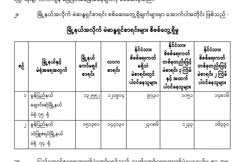 ယနေ့နံနက်(၀၉:၃၀)နာရီအချိန်ထိမိုးလေဝသတိုင်းထွာချက်အကျဉ်းချုပ်။ လွန်ခဲ့သော(၂၄)နာရီအတွင်းက စစ်ကိုင်းတိုင်းဒေသကြီးအောက်ပိုင်းတွင် တိမ်အသင့်အတင့် ဖြစ်ထွန်းခဲ့ပြီး၊ နေပြည်တော်၊ မကွေးတိုင်းဒေသကြီး၊ ရန်ကုန်တိုင်းဒေသကြီး၊ ဧရာဝတီတိုင်းဒေသကြီး၊ ကချင်ပြည်နယ်နှင့် ရခိုင် ပြည်နယ်တို့တွင် နေရာကွက်ကျား၊ မန္တလေးတိုင်းဒေသကြီး၊ ချင်းပြည်နယ်နှင့် ကရင်ပြည်နယ်တို့တွင် နေရာကျဲကျဲ၊ ပဲခူးတိုင်းဒေသကြီး၊ ရှမ်းပြည်နယ်နှင့် ကယားပြည်နယ်တို့တွင် နေရာစိပ်စိပ်နှင့် ကျန်တိုင်းဒေသကြီးနှင့် ပြည်နယ်တို့တွင် နေရာအနှံ့အပြား မိုးထစ်ချုန်းရွာခဲ့ကာ၊ တနင်္သာရီတိုင်းဒေသကြီးတွင် နေရာကွက်၍ မိုးကြီးခဲ့ပါသည်။ နေ့အပူချိန်များမှာ ပဲခူးတိုင်းဒေသကြီး၊ ရခိုင်ပြည်နယ်နှင့် မွန်ပြည်နယ်တို့တွင် မေလ၏ ပျမ်းမျှအပူချိန်တို့ထက် (၃)ဒီဂရီ စင်တီဂရိတ်နှင့် ရန်ကုန်တိုင်းဒေသကြီး၊ ဧရာဝတီတိုင်းဒေသကြီးနှင့် တနင်္သာရီတိုင်းဒေသကြီးတို့တွင် မေလ၏ ပျမ်းမျှအပူချိန်တို့ထက် (၂)ဒီဂရီစင်တီ ဂရိတ်ပိုခဲ့ပြီး၊ ကျန်တိုင်းဒေသကြီးနှင့် ပြည်နယ်တို့တွင် မေလ၏ ပျမ်းမျှအပူချိန်ခန့်သာရှိခဲ့ပါသည်။