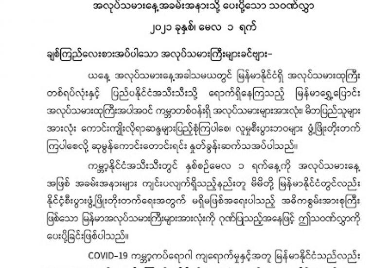 (၂၉-၄-၂၀၂၁) ရက်နေ့၊ ည (၈:၀၀) နာရီမှ (၃၀-၄-၂၀၂၁) ရက်နေ့၊ ည (၈:၀၀) နာရီအတွင်း ဓာတ်ခွဲနမူနာစုစုပေါင်း (၁,၅၃၄) ခုအား စစ်ဆေးပြီးစီးခဲ့ရာ COVID-19 ရောဂါ ဓာတ်ခွဲအတည်ပြု လူနာသစ် (၁၇) ဦး တွေ့ရှိရပါသည်။ သို့ဖြစ်ပါ၍ ယနေ့အထိ ဓာတ်ခွဲနမူနာ စုစုပေါင်း (၂,၅၇၆,၃၀၇) ခု အား စစ်ဆေးခဲ့ပြီး COVID-19 ဓာတ်ခွဲအတည်ပြုလူနာ စုစုပေါင်း (၁၄၂,၈၁၇) ဦး ရှိပြီ ဖြစ်ပါသည်။