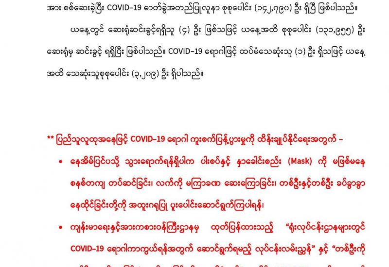 ကျန်းမာရေးနှင့် အားကစားဝန်ကြီးဌာနက ဧပြီလ ၂၇ ရက်နေ့ ည ၈ နာရီ သတင်း ထုတ်ပြန်ချက်အရ တစ်ရက်အတွင်း ဓာတ်ခွဲနမူနာစုစုပေါင်း ၂၄၄၆ ခုအား စစ်ဆေး ပြီးစီးခဲ့ရာ ကိုဗစ်-၁၉ ရောဂါ ဓာတ်ခွဲအတည်ပြုလူနာသစ် ၃၈ ဦးတွေ့ရှိခဲ့ပြီး ကိုဗစ် -၁၉ ရောဂါဖြင့် ထပ်မံသေဆုံးသူတစ်ဦးရှိခဲ့ကြောင်း သိရသည်။