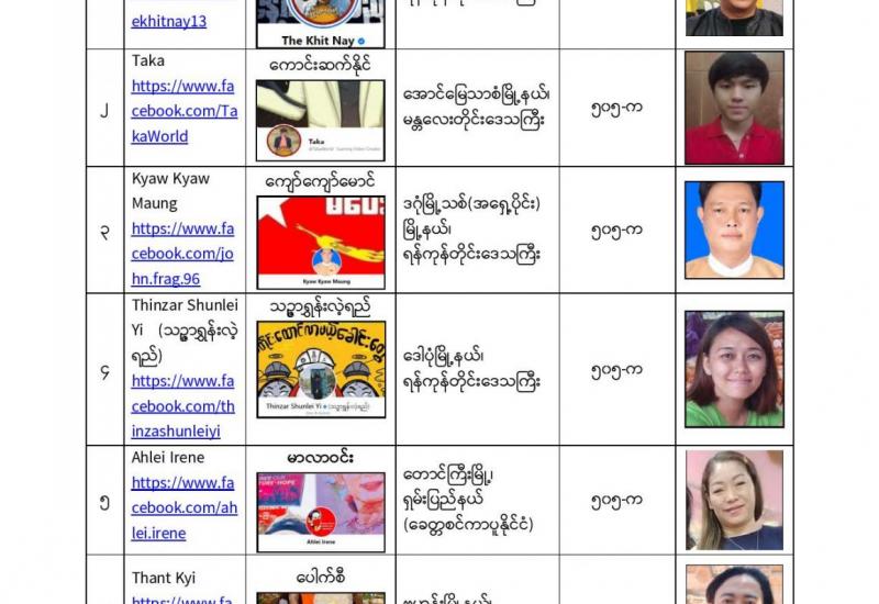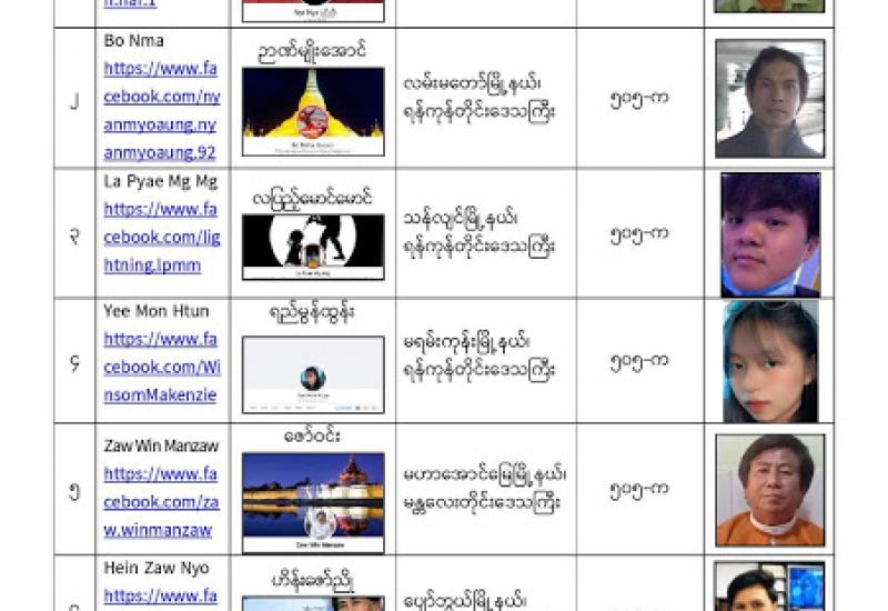 နိုင်ငံတော်၏ အုပ်ချုပ်မှုယန္တရားပျက်ပြားစေရန်ရည်ရွက်ချက်ဖြင့် နိုင်ငံ့ဝန်ထမ်းများအား CDM လှုပ်ရှားမှုတွင် ပါဝင်စေရန်လှုံ့ဆော်ခြင်း၊ CRPH မတရားအသင်းအား ထောက်ခံသည့် အကြောင်းအရာများ၊ မမှန်သတင်းများ အားဖြန့်ဝေခြင်း၊ နိုင်ငံတော်တည်ငြိမ်အေးချမ်းမှုကို ပျက်ပြားစေပြီး ဆူပူအုံကြွမှုဖြစ်ပေါ်စေရန်နှင့် အများပြည်သူ အထိတ်တလန့်ဖြစ်စေရန် အတွက် သွေးထိုးလှုံ့ဆော်မှုများပြုလုပ်ခြင်း၊ Social Pumishment ပြုလုပ်ခြင်းများကို လူမှုကွန်ရက် စာမျက်နှာများတွင် ရည်ရွယ်ချက်ရှိရှိ ဖြင့်ဖော်ပြခြင်းနှင့် ဖြန့်ဝေခြင်းများ ဆောင်ရွက် လျက်ရှိသည့် အောက်ဖော်ပြပါ အနုပညာရှင်အချို့နှင့် အခြားပါဝင်ပတ်သက်သူများအား ရာဇသတ်ကြီးပုဒ်မ ၅၀၅-က ဖြင့် အမှုဖွင့်အရေးယူ ဆောင်ရွက်လျက်ရှိပါသည်။