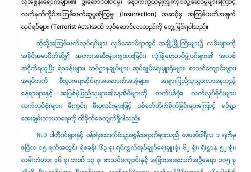 နိုင်ငံတော်အတွင်း ဆူပူအကြမ်းဖက်သူလူစုအုပ်စုများအနေဖြင့် လုံခြုံရေး တပ်ဖွဲ့ဝင် များ၏ အလစ်အငိုက်ကို အခွင့်ကောင်းယူကာ နိုင်ငံတော်ပိုင်အဆောက် အဦများ၊ အေးချမ်းစွာနေထိုင်လိုသော ပြည်သူလူထုအချို့၏ နေအိမ်များအား မီးပုလင်း ဖြင့်ပစ် ပေါက်ခြင်း၊ မီးရှို့ခြင်းများအပြင် အများပြည်သူ သွားလာလှုပ်ရှားနေသော လမ်းမ ကြီးများပေါ်တွင် လက်လုပ်ဗုံးများ ပစ်ဖောက်ခြင်း၊ ထောင်ထား ခြင်းများအား ပြုလုပ် နေကြသည်ကို တွေ့ရှိနေရပါသည်။
