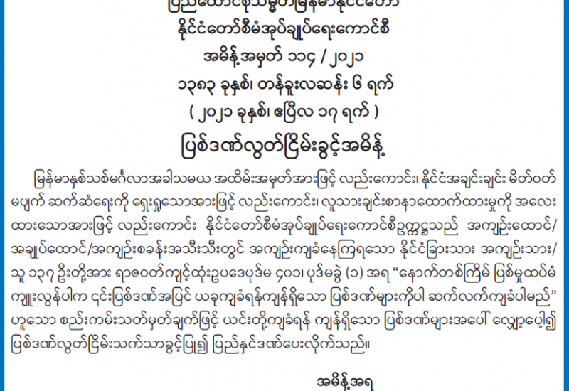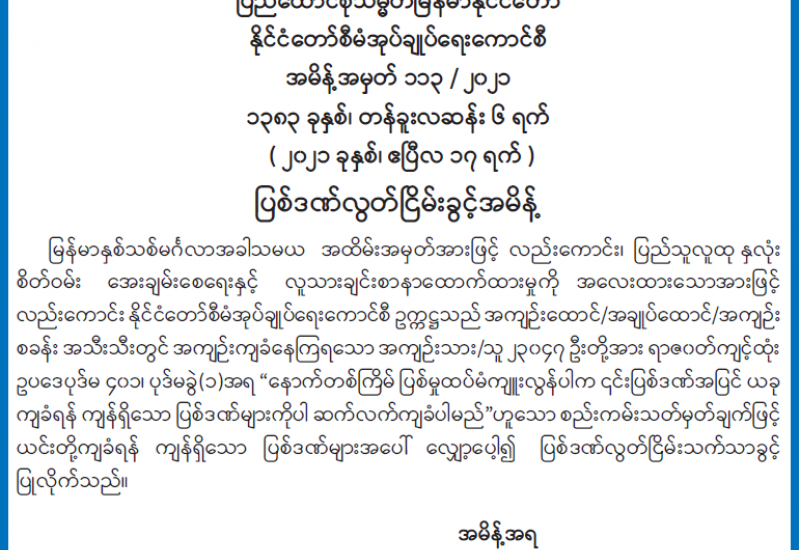 ပြည်ထောင်စုသမ္မတမြန်မာနိုင်ငံတော်သည် မြန်မာနှစ်သစ်မင်္ဂလာအခါသမယအထိမ်းအမှတ်အား ဖြင့် လည်းကောင်း ၊ အေးချမ်းသာယာပြီး ခေတ်မီဖွံ့ဖြိုးတိုးတက်သော စည်းကမ်းပြည့်ဝသည့် ဒီမိုက ရေစီ နိုင်ငံ တော်သစ်တည်ဆောက်နေချိန်တွင် ပြစ်ဒဏ်ကျ အကျဉ်းသား၊ အကျဉ်းသူများမှလည်း တစ်ဖက် တစ်လမ်းမှ အကျိုးပြုစေမည့် နိုင်ငံသားများအဖြစ်သို့ ပြောင်းလဲပေးရန်အတွက်လည်းကောင်း၊ ပြည်သူ လူထု နှလုံးစိတ်ဝမ်းအေးချမ်းစေရေးနှင့် လူသားချင်းစာနာထောက်ထားမှုကို အလေးထားသော အားဖြင့် လည်းကောင်း၊ နိုင်ငံအချင်းချင်း မိတ်ဝတ်မပျက်ဆက်ဆံရေးကို ရှေးရှုသောအားဖြင့် လည်း ကောင်း၊ နိုင်ငံတော် စီမံအုပ်ချုပ်ရေးကောင်စီဉက္ကဌ က အမိန့်အမှတ် ၁၁၃/၂၀၂၁ နှင့် ၁၁၄/၂၀၂၁ တို့ဖြင့် အကျဉ်းထောင်၊ အချုပ်ထောင်၊ စခန်းအသီးသီးတို့တွင် အကျဉ်းကျခံနေကြရသော အကျဉ်းသား၊ အကျဉ်းသူ နိုင်ငံသား ၂၃၀၄၇ ဦးနှင့် နိုင်ငံခြားသား အကျဉ်းသား၊အကျဉ်းသူ ၁၃၇ ဦး၊ စုစုပေါင်း ၂၃၁၈၄ ဦးတို့ကို ယနေ့တွင် ပြစ်ဒဏ်လွတ်ငြိမ်းသက်သာခွင့် ပြုခဲ့ကြောင်းသိရသည်။