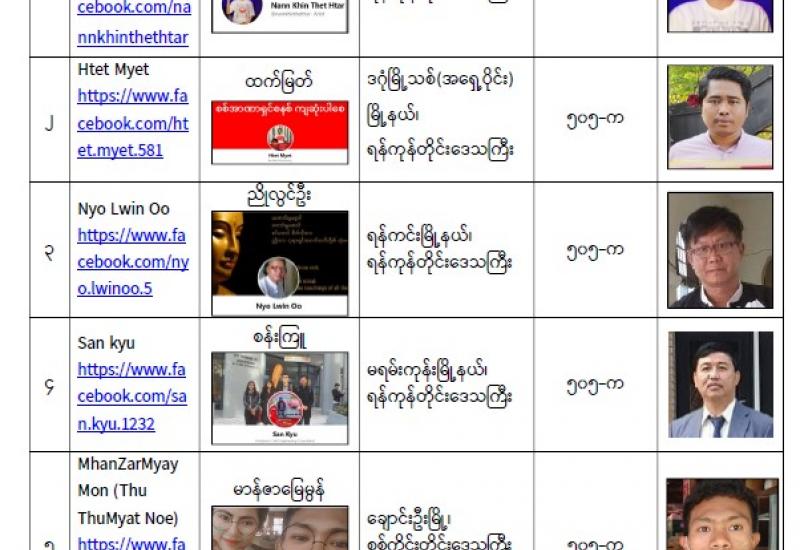 နိုင်ငံတော်၏ အုပ်ချုပ်မှုယန္တရားပျက်ပြားစေရန်ရည်ရွက်ချက်ဖြင့် နိုင်ငံ့ဝန်ထမ်းများအား CDM လှုပ်ရှား မှုတွင် ပါဝင်စေရန်လှုံ့ဆော်ခြင်း၊ CRPH မတရားအသင်းအား ထောက်ခံသည့် အကြောင်းအရာများ၊ မမှန်သတင်းများအားဖြန့်ဝေခြင်း၊ နိုင်ငံတော်တည်ငြိမ်အေးချမ်းမှုကို ပျက်ပြားစေပြီး ဆူပူအုံကြွမှုဖြစ် ပေါ်စေရန်နှင့် အများပြည်သူအထိတ်တလန့်ဖြစ်စေရန် အတွက် သွေးထိုးလှုံ့ဆော်မှုများပြုလုပ်ခြင်း၊ Social Pumishment ပြုလုပ်ခြင်းများကို လူမှုကွန်ရက် စာမျက်နှာများတွင် ရည်ရွယ်ချက်ရှိရှိ ဖြင့်ဖော် ပြခြင်းနှင့် ဖြန့်ဝေခြင်းများ ဆောင်ရွက် လျက်ရှိသည့် အောက်ဖော်ပြပါ အနုပညာရှင်အချို့နှင့် အခြား ပါဝင် ပတ်သက်သူများအား ရာဇသတ်ကြီးပုဒ်မ ၅၀၅-က ဖြင့် အမှုဖွင့်အရေးယူ ဆောင်ရွက် လျက်ရှိပါသည်။