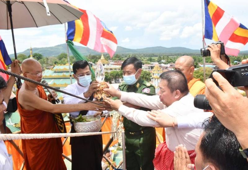 မွန်ပြည်နယ်၊ မော်လမြိုင်မြို့၊ ခေါင်းဆေးကျွန်းတွင် တည်ထားကိုးကွယ်လျက်ရှိ သော သမိုင်းဝင်ဆံ တော်ရှင်သစ္စာမဏ္ဍိုင်စေတီတော်မြတ်ကြီး ရတနာစိန်ဖူးတော်၊ ငှက်မြတ်နားတော်နှင့် ရွှေထီးတော်ဘုံ အဆင့်ဆင့် တင်လှူပူဇော်ပွဲကို ယနေ့နံနက်ပိုင်း တွင် အဆိုပါစေတီတော်မြတ်ကြီး၌ ပြုလုပ်ရာ အလှူတော်မင်္ဂလာအခမ်းအနားသို့ ခေါင်းဆေးကျွန်းကျောင်းတိုက်ဆရာတော် ဘဒ္ဒန္တသုမင်္ဂလ အမှူးပြုသော သံဃာတော် များ၊ သာသနာ့နွယ်ဝင်သီလရှင်များ ကြွရောက်ချီးမြှင့်တော်မူကြပြီး မွန်ပြည်နယ်၊ စီမံ အုပ်ချုပ်ရေးကောင်စီဥက္ကဋ္ဌ ဦးဇော်လင်းထွန်း၊ အရှေ့တောင်တိုင်းစစ်ဌာနချုပ် တိုင်းမှူး ဗိုလ်ချုပ် ကိုကိုမောင်နှင့် အဖွဲ့ဝင်များ၊ မြို့ပေါ်ရပ်ကွက်နေ ပြည်သူများ တက်ရောက် ကြည်ညိုကြသည်။