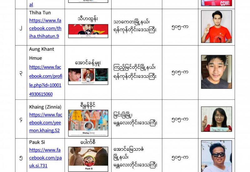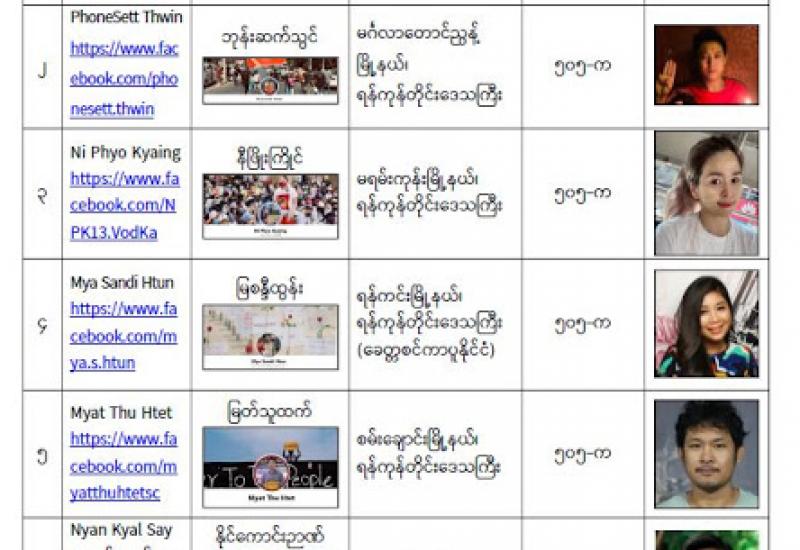 နိုင်ငံတော်၏ အုပ်ချုပ်မှုယန္တရားပျက်ပြားစေရန်ရည်ရွက်ချက်ဖြင့် နိုင်ငံ့ဝန်ထမ်းများအား CDM လှုပ်ရှားမှုတွင် ပါဝင်စေရန်လှုံ့ဆော်ခြင်း၊ CRPH မတရားအသင်းအား ထောက်ခံသည့် အကြောင်းအရာများ၊ မမှန်သတင်းများအား ဖြန့်ဝေခြင်း၊ နိုင်ငံတော်တည်ငြိမ်အေးချမ်းမှုကို ပျက်ပြားစေပြီး ဆူပူအုံကြွမှုဖြစ်ပေါ်စေရန်နှင့် အများပြည်သူ အထိတ် တလန့်ဖြစ်စေရန် အတွက် သွေးထိုးလှုံ့ဆော်မှုများပြုလုပ်ခြင်း၊ Social Pumishment ပြုလုပ်ခြင်းများကို လူမှုကွန်ရက် စာမျက်နှာများတွင် ရည်ရွယ်ချက်ရှိရှိ ဖြင့်ဖော်ပြခြင်းနှင့် ဖြန့်ဝေခြင်းများ ဆောင်ရွက် လျက်ရှိသည့် အောက်ဖော်ပြပါ အနုပညာရှင်အချို့နှင့် အခြားပါဝင်ပတ်သက်သူများအား ရာဇသတ်ကြီးပုဒ်မ ၅၀၅-က ဖြင့် အမှုဖွင့်အရေးယူ ဆောင်ရွက်လျက်ရှိပါသည်။