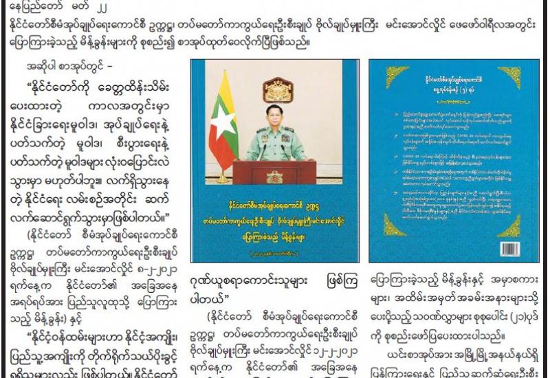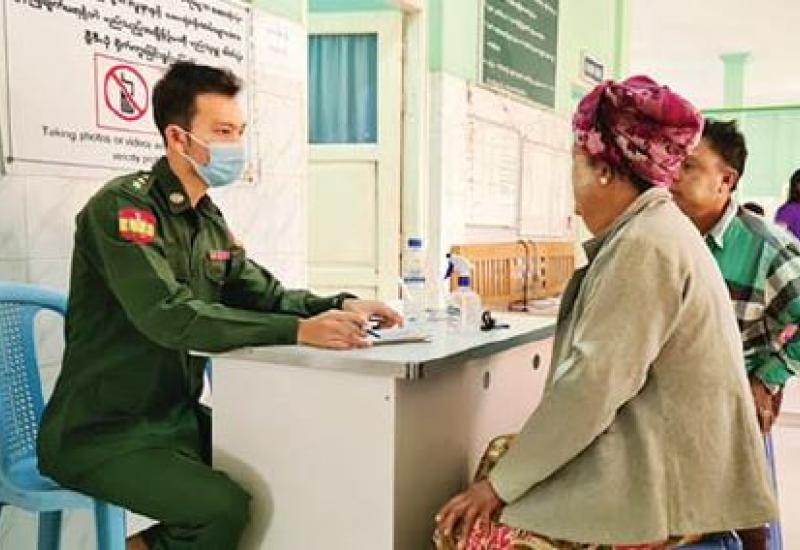 တိုင်းဒေသကြီးနှင့်ပြည်နယ်များရှိ တိုင်းရင်းသား ပြည်သူများအတွက် တပ်မတော်ဆေးရုံများ နှင့် ယာယီကုသရေးဆေးရုံများ တွင် ကျန်းမာရေးစောင့်ရှောက်မှု များကို ဆောင်ရွက်ပေးလျက်ရှိရာ ဖေဖော်ဝါရီ၅ ရက်မှ ယနေ့အထိ ပြင်ပလူနာ ၈၆၇၅ဝ ဦး၊ အတွင်း လူနာ ၄၁၉၃ ဦးကို တပ်မတော်မှ ပါရဂူများ၊ ဆေးမှူးများ၊ သူနာပြု များဖြင့် ကျန်းမာရေး စစ်ဆေးပေး ခြင်း၊ ခွဲစိတ်ရန် လိုအပ်သည့်လူနာ များအား ခွဲစိတ်ပေးခြင်း၊ ဆေးရုံ တက်ရောက်ကုသရန် လိုအပ်သော လူနာများကို ဆေးရုံတင်ကာ ကျန်းမာရေးစောင့်ရှောက် ပေးခြင်းများဆောင်ရွက်ပေးသည့် အပြင် ဆေးရုံတက်လူနာများနှင့် လူနာစောင့်များ နေထိုင် စားသောက်ရေး အဆင်ပြေစေရန် အတွက်ကိုပါ စီမံဆောင်ရွက် ပေးသည်။ (ယာပုံ)