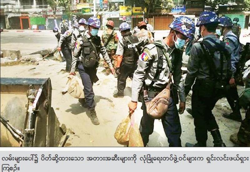 ရန်ကုန်တိုင်းဒေသကြီး လှိုင်မြို့နယ်တွင် လုံခြုံရေး တပ်ဖွဲ့ဝင်များက ဆူပူအကြမ်းဖက်သူများ တားဆီး ပိတ်ဆို့ထားသော အတားအဆီးများကို ရှင်းလင်းဖယ်ရှားခဲ့ကြောင်း မြန်မာနိုင်ငံရဲတပ်ဖွဲ့၏ သတင်းထုတ်ပြန်ချက်အရ သိရသည်။