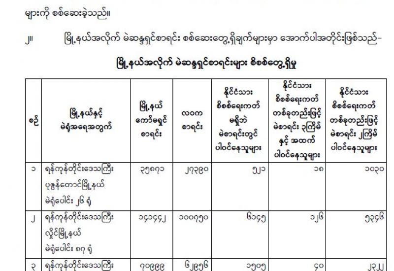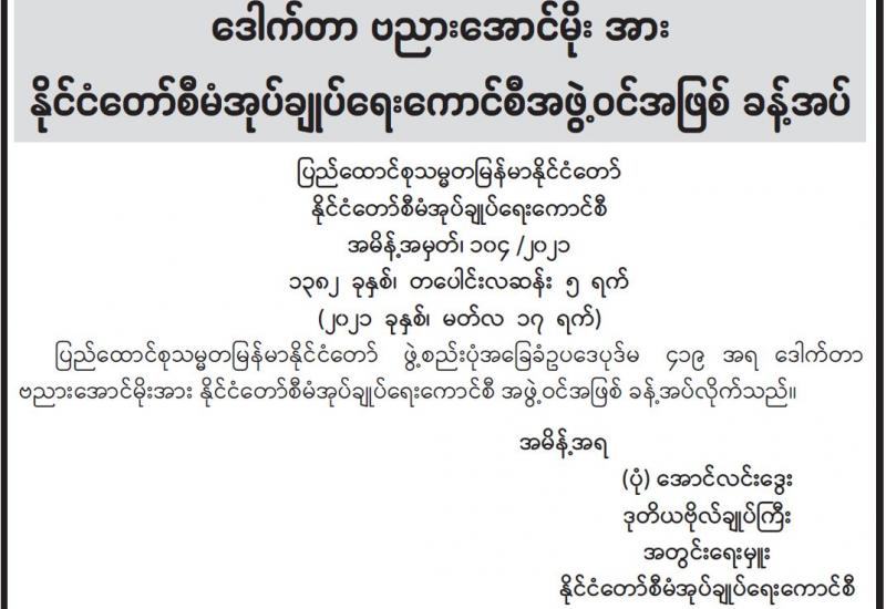 နေပြည်တော်စည်ပင်သာယာရေးကော်မတီသုခတော်ဝင်အိမ်ရာတွင် ဒုတိယအဆင့် ဆောက်လုပ်ပြီးစီးသည့် တိုက်များမှငွေပေးသွင်းပြီးသော မြေညီထပ် အခန်း (၃၀)၊ ပထမထပ် (၂၂)ခန်းနှင့် ဒုတိယထပ် (၁၄)ခန်း၊ စုစုပေါင်း (၆၆) ခန်းတို့အား မဲနှိုက်နေရာချထားခြင်း အခမ်းအနားကို ယနေ့နံနက် ၉ နာရီက နေပြည်တော်စည်ပင်သာယာရေးကော်မတီ မင်္ဂလာခန်းမ၌ ကျင်းပသည်။