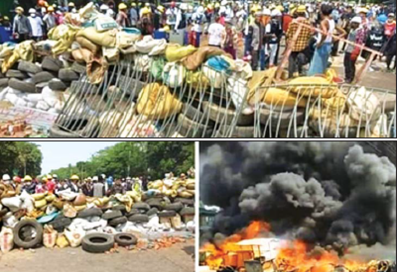 ရန်ကုန်တိုင်းဒေသကြီး မြောက်ဥက္ကလာပမြို့နယ် (၂) ရပ်ကွက်အနီး၌ ယနေ့တွင် ဆူပူဆန္ဒပြသူ အချို့က အုပ်စုဖွဲ့၍ ဆူပူဆန္ဒပြမှုများ ဆောင်ရွက်လျက်ရှိပြီး လုံခြုံရေးတပ်ဖွဲ့ဝင်များလာရောက်၍ လူစုခွဲမှုများ ၊ မပြုလုပ်နိုင်ရန် ကားလမ်းမပေါ်တွင် အတားအဆီးများပိတ်ဆို့ခဲ့သည်။ ၎င်းအပြင် လုံခြုံရေးတပ်ဖွဲ့ဝင်များအား ဘေးအန္တရာယ်ဖြစ်ပွားစေရန်နှင့် ရပ်ကွက်အတွင်းရှိ အေးချမ်းစွာ နေထိုင်လျက်ရှိသော ပြည်သူများကိုပါ ဆူပူမှုတွင် ပါဝင်လာစေရန် ရည်ရွယ်ချက်ဖြင့် ကားလမ်းပေါ်တွင် တာယာကွင်းများချထား၍ မီးရှို့မှုများ ၊ ကိုပါ ဆောင်ရွက်ခဲ့ကြောင်း သိရသည်။