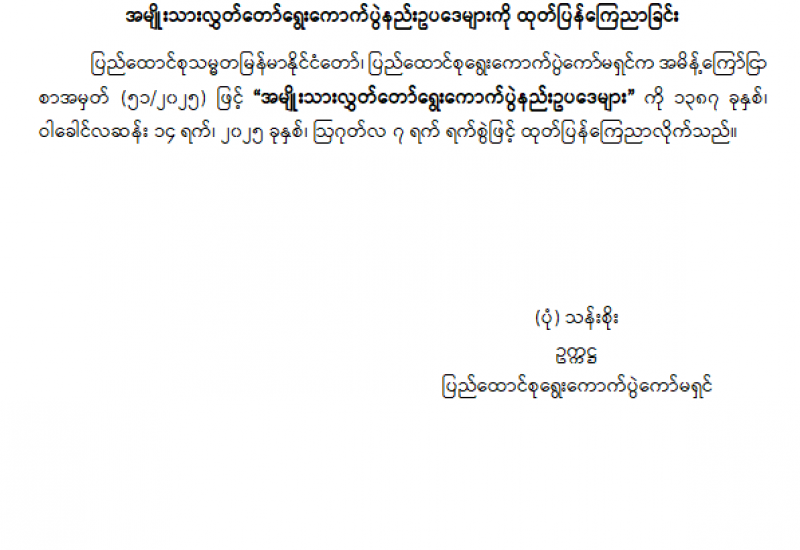 အမျိုးသားလွှတ်တော်ရွေးကောက်ပွဲနည်းဥပဒေများကို ထုတ်ပြန်ကြေညာခြင်း