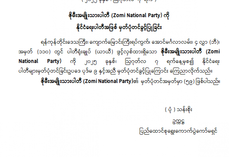 ဇိုမီးအမျိုးသားပါတီ (Zomi National Party) ကို နိုင်ငံရေးပါတီအဖြစ် မှတ်ပုံတင်ခွင့်ပြုခြင်း