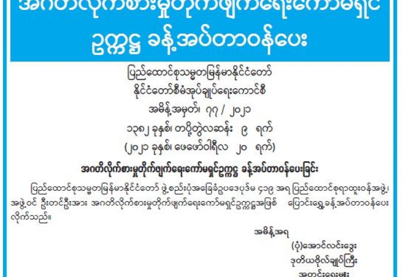 နိုင်ငံတော်စီမံအုပ်ချုပ်ရေးကောင်စီ၏ ပြည်သူသို့အသိပေးချက် နိုင်ငံတော်၏အကျိုးကို သယ်ပိုးဆောင်ရွက်ရန်အတွက် နိုင်ငံ့တာဝန်များကို မပျက်မကွက် ဆက်လက် ထမ်းဆောင်လျက်ရှိသည့် နိုင်ငံ့ဝန်ထမ်းများ လုပ်ငန်းခွင် မဝင်နိုင်အောင် နိုင်ငံတော်ကို ဆန့်ကျင်နှောင့်ယှက်မှုပြုနေသူအချို့က နည်းအမျိုးမျိုးဖြင့် ဖိအားပေးခြင်း၊ ခြိမ်းခြောက်ခြင်းများ ပြုလုပ်နေကြောင်းကို ကြားသိနေရပါသည်။ ဖိအားပေးခြိမ်းခြောက်သူများအနေဖြင့် ယင်းလုပ်ရပ် များသည် ဥပဒေနှင့်ဆန့်ကျင်သကဲ့သို့ မိမိ၏အခွင့်အရေးနှင့် လွတ်လပ်ခွင့်များကို ကျင့်သုံးခြင်း ဆိုင်ရာ မူသဘောတရားများနှင့်လည်း ဆန့်ကျင်နေပါသည်။ ဝန်ထမ်းမဟုတ်သူ ပြည်သူလူထု အချင်းချင်းကြားတွင်လည်း အလားတူ