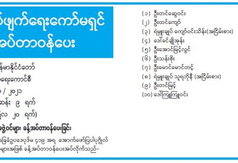 ကချင်ပြည်နယ်စီမံအုပ်ချုပ်ရေး ကောင်စီ၏ဒေသဖွံ့ဖြိုးရေး အရအသုံးဆိုင်ရာ ကိစ္စရပ်များနှင့် ပြည်နယ်စည်ပင်သာယာရေးအဖွဲ့၏ အရပ်ရပ်ဆိုင်ရာ လေလံကိစ္စရပ်များနှင့်စပ်လျဉ်း၍ ပြည်နယ် ကောင်စီအဖွဲ့ဝင်များက သက်ဆိုင်ရာ ဌာနဆိုင်ရာ အကြီးအကဲများနှင့် လုပ်ငန်းညှိနှိုင်းအစည်းအဝေး များကို ဖေဖော်ဝါရီ ၁၉ ရက်တွင် ပြည်နယ်စီမံအုပ်ချုပ်ရေးကောင်စီရုံး အစည်းအဝေးခန်းမ၌ ကျင်းပ သည်။