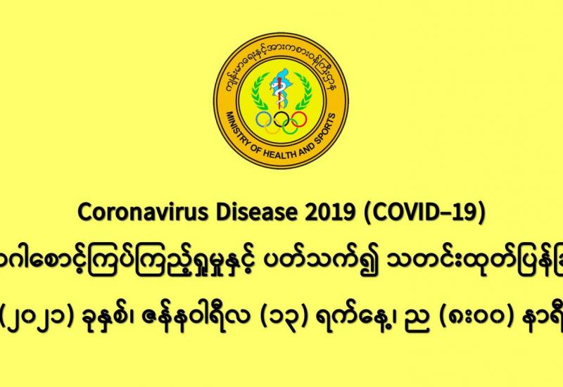 (၁၂-၁-၂၀၂၁) ရက်နေ့၊ ည (၈:၀၀) နာရီမှ (၁၃-၁-၂၀၂၁) ရက်နေ့၊ ည (၈:၀၀) နာရီ အတွင်း ဓာတ်ခွဲနမူနာ စုစုပေါင်း (၁၇,၈၂၇) ခုအား စစ်ဆေးပြီးစီးခဲ့ရာ COVID-19 ရောဂါ ဓာတ်ခွဲ အတည်ပြု လူနာသစ် (၅၂၃) ဦး တွေ့ရှိရပါသည်။