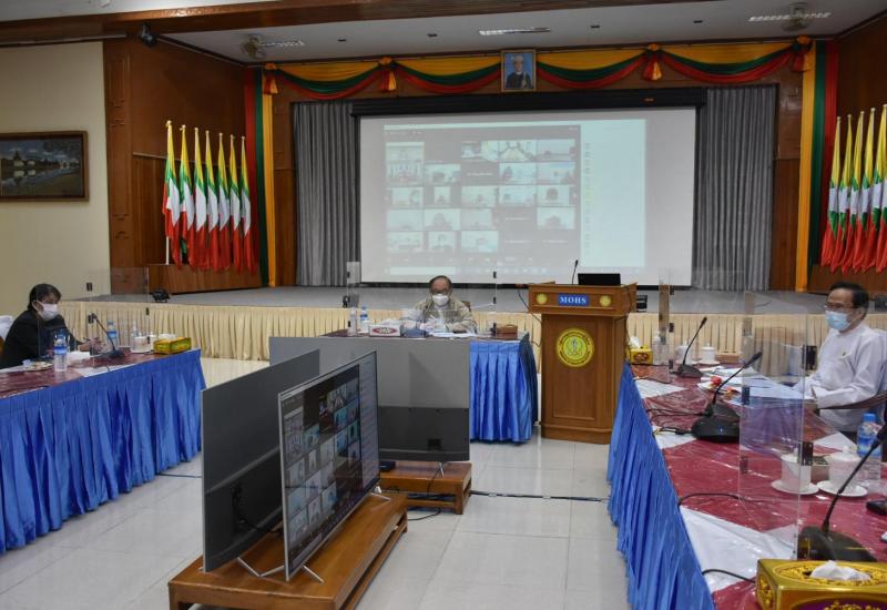 ကိုဗစ်-၁၉ ကာကွယ်ဆေး ရရှိလာနိုင်မှုအခြေအနေ အမျိုးအမျိုးအပေါ်မူတည်၍ စနစ်တကျခွဲဝေ ထိုးနှံနိုင်ရေး သဏ္ဍာန်တူစားပွဲတင်လေ့ကျင့် ကြိုတင်ပြင်ဆင်ခြင်း အခမ်းအနားကို ယမန်နေ့ ညနေပိုင်းက နေပြည်တော်ရှိ ကျန်းမာရေးနှင့်အားကစားဝန်ကြီးဌာန၌ ဗီဒီယိုကွန်ဖရင့်စနစ်ဖြင့် ကျင်းပသည်။