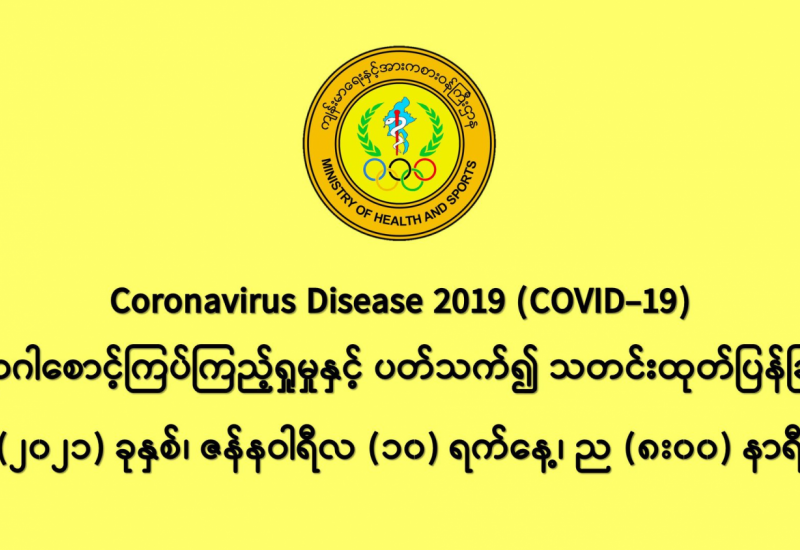 (၉-၁-၂၀၂၁) ရက်နေ့၊ ည (၈:၀၀) နာရီမှ (၁၀-၁-၂၀၂၁) ရက်နေ့၊ ည (၈:၀၀) နာရီ အတွင်း ဓာတ်ခွဲနမူနာ စုစုပေါင်း (၁၇,၃၄၃) ခုအား စစ်ဆေးပြီးစီးခဲ့ရာ COVID-19 ရောဂါ ဓာတ်ခွဲ အတည်ပြု လူနာသစ် (၅၅၅) ဦး တွေ့ရှိရပါသည်။