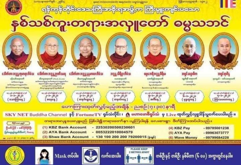 ရန်ကုန်တိုင်းဒေသကြီးအစိုးရအဖွဲ့ က ကြီးမှူးကျင်းပမည့် နှစ်သစ်ကူးတရားတော်အား ရုပ်သံလိုင်းများမှ ထုတ်လွှင့်ပြသမည်ဖြစ်ကြောင်း ဒီဇင်ဘာ ၂၃ ရက် က ကျင်းပရေးကော်မတီထံမှ သိရသည်။