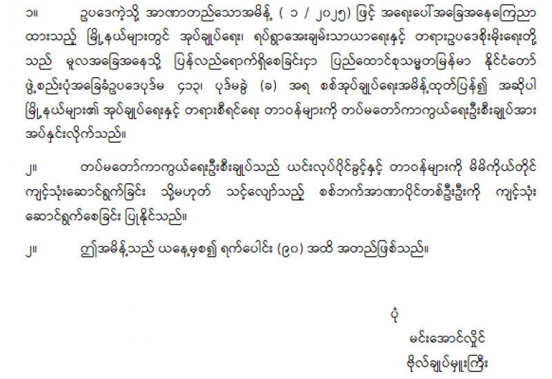 မြန်မာနိုင်ငံတော်ဗဟိုဘဏ် ဥက္ကဋ္ဌ၊ ဒုတိယဥက္ကဋ္ဌနှင့် ဒါရိုက်တာအဖွဲ့ဝင်များ ခန့်အပ်တာဝန်ပေးခြင်း