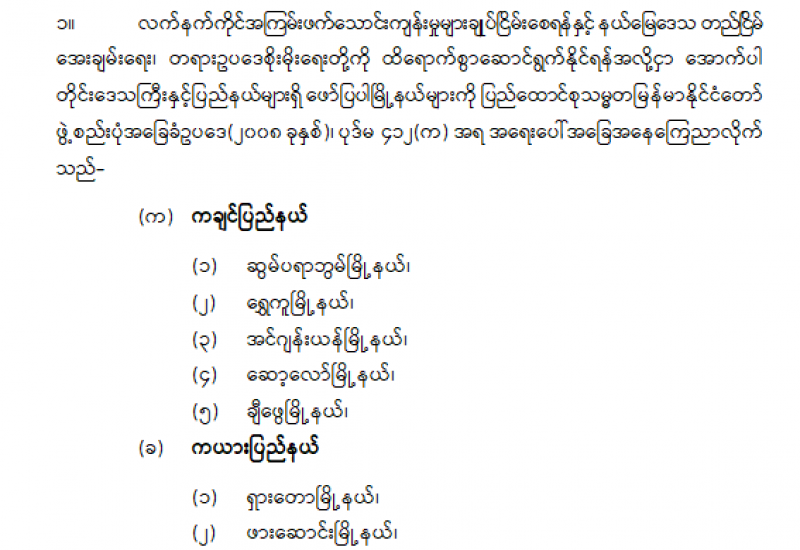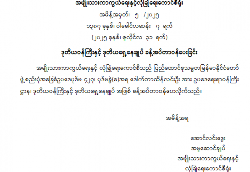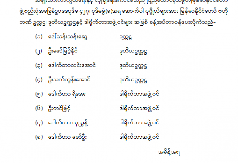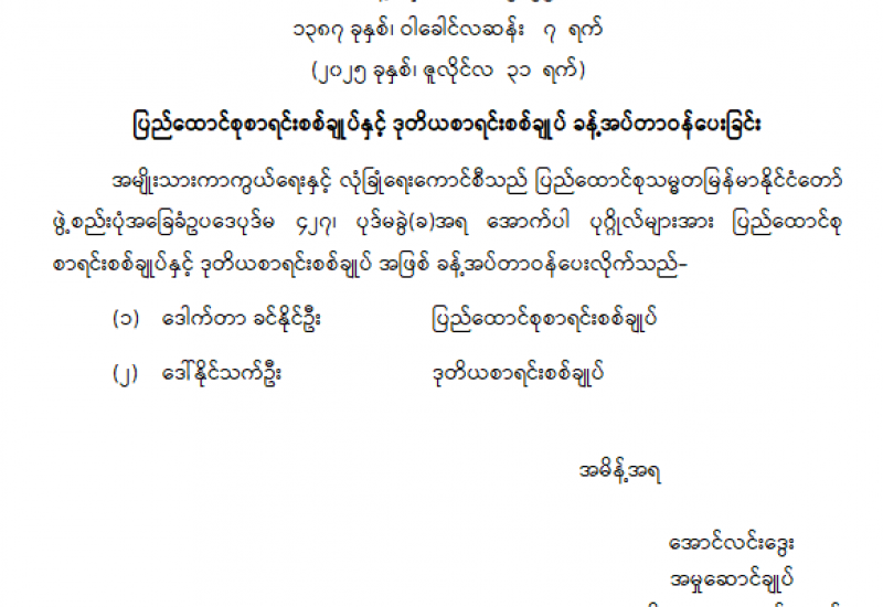 ဒုတိယဝန်ကြီးနှင့် ဒုတိယရှေ့နေချုပ် ခန့်အပ်တာဝန်ပေးခြင်း