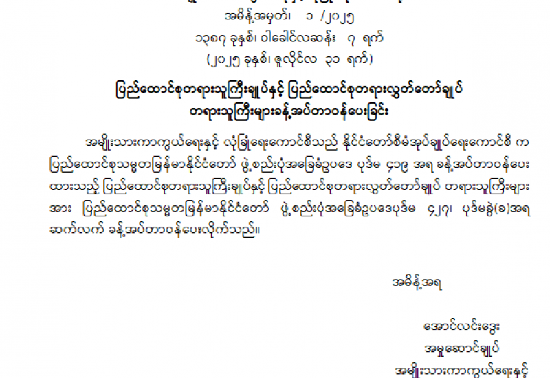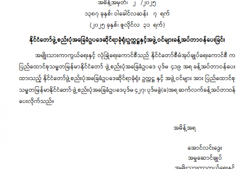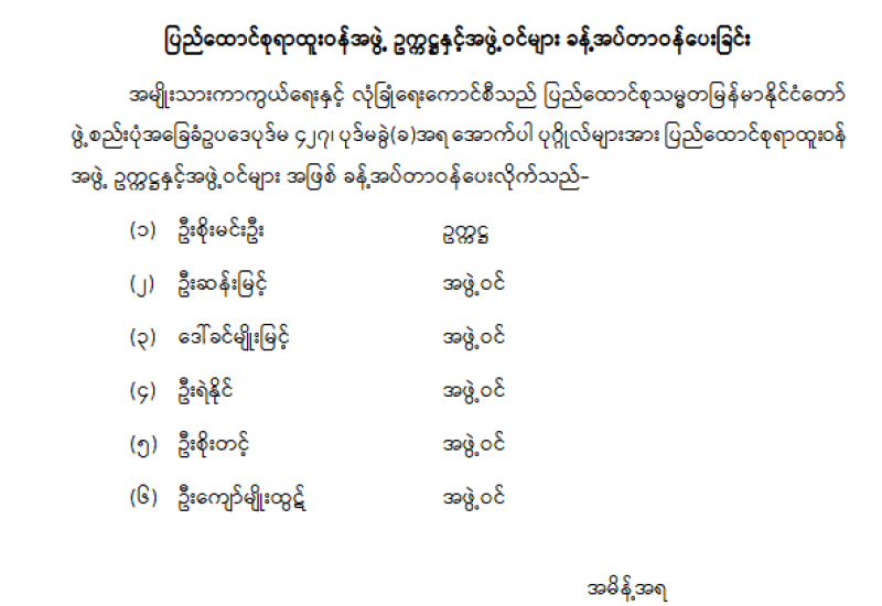 ပြည်ထောင်စုရွေးကောက်ပွဲကော်မရှင် ဥက္ကဋ္ဌနှင့် အဖွဲ့ဝင်များ ခန့်အပ်တာဝန်ပေးခြင်း