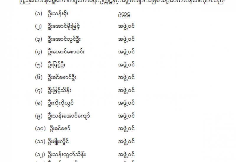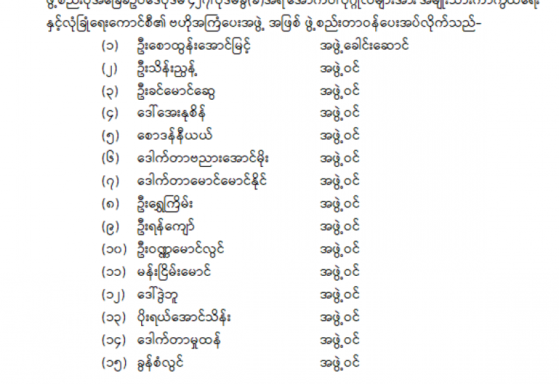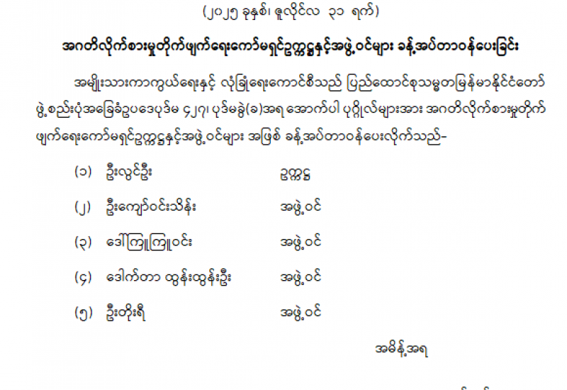ပြည်ထောင်စုရာထူးဝန်အဖွဲ့ ဥက္ကဋ္ဌနှင့် အဖွဲ့ဝင်များ ခန့်အပ်တာဝန်ပေးခြင်း