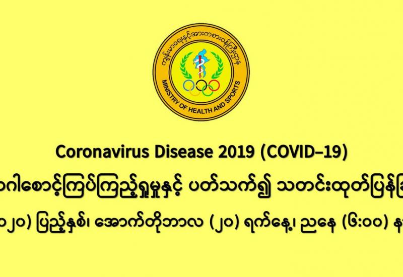 COVID-19 ရောဂါစောင့်ကြပ်ကြည့်ရှုမှုနှင့်ပတ်သက်၍ သတင်းထုတ်ပြန်ခြင်း (၂၀-၁၀-၂၀၂၀) ရက်နေ့၊ ညနေ (၆:၀၀)နာရီ