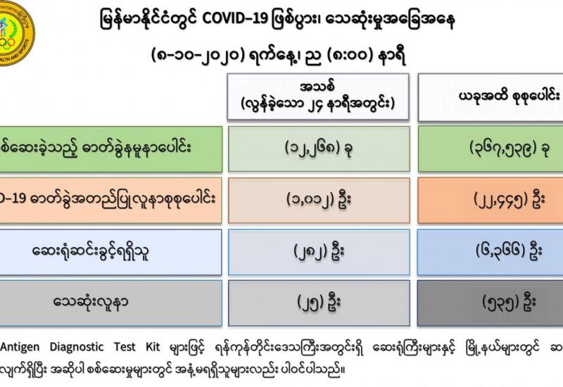 (၈-၁၀-၂၀၂၀) ရက်နေ့၊ ည (၈:၀၀)နာရီမှ (၉-၁၀-၂၀၂၀) ရက်နေ့၊ ည (၈:၀၀) နာရီ အတွင်းဓာတ်ခွဲနမူနာ စုစုပေါင်း (၁၅,၃၀၁)ခုအား စစ်ဆေးပြီးစီးခဲ့ရာ COVID-19 ရောဂါ ဓာတ်ခွဲ အတည်ပြု လူနာသစ် (၁,၄၆၁)ဦး တွေ့ရှိရပါသည်။