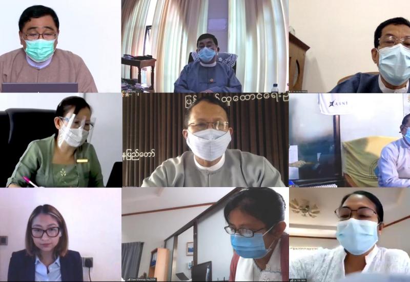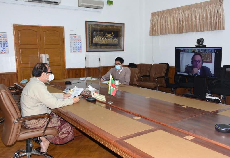 UNOPS အဖွဲ့မှ ဝန်ကြီးဌာန၏ COVID-19 တုံ့ပြန်ဆောင်ရွက်ရေး ဆေးနှင့်ဆေးပစ္စည်းများ ဝယ်ယူ ပံ့ပိုးမှု အခြေအနေ၊ Global Fund ထောက်ပံ့ငွေဖြင့် တီဘီ၊ ခုခံကျ/ကာလ သားနှင့် ငှက်ဖျားရောဂါများ တိုက်ဖျက်ရေး အတွက် (၂၀၂၁-၂၀၂၃) ခုနှစ် အထိ သဘောတူညီ ချက်လက်မှတ် ရေးထိုးရေးကိစ္စများနှင့် စပ်လျဉ်းသည့် ဆွေးနွေး ပွဲကို ယနေ့မွန်းလွဲပိုင်းတွင် ကျန်းမာရေးနှင့် အားကစားဝန်ကြီးဌာန၌ Video Conferencing စနစ်ဖြင့် ကျင်းပသည်။