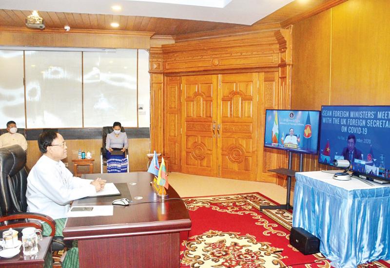 အပြည်ပြည်ဆိုင်ရာပူးပေါင်းဆောင်ရွက်ရေးဝန်ကြီးဌာန ပြည်ထောင်စုဝန်ကြီး ဦးကျော်တင်သည် ယနေ့ မွန်းလွဲ ၂ နာရီခွဲတွင် ဗီဒီယိုကွန်ဖရင့်စနစ်ဖြင့် ကျင်းပသည့် အာဆီယံ နိုင်ငံခြားရေးဝန်ကြီးများနှင့် ဗြိတိန်နိုင်ငံခြားရေး ဝန်ကြီးတို့၏ ကိုဗစ်-၁၉ ကူးစက်ရောဂါဆိုင်ရာ အစည်းအဝေးသို့ နိုင်ငံခြားရေးဝန်ကြီးဌာန နေပြည်တော်မှ ပါဝင်တက်ရောက် သည်။