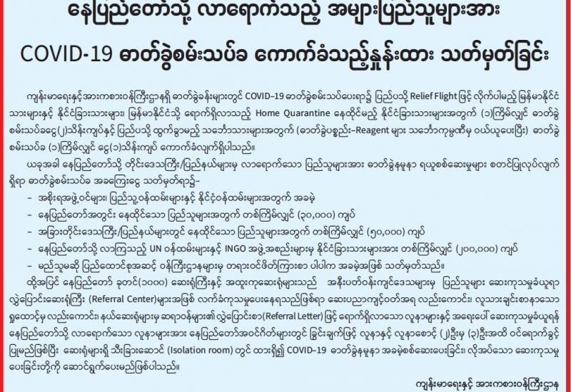 နေပြည်တော် လာရောက်သည့် ပြည်သူ့များအား Covid-19 ဓာတ်ခွဲစမ်းသပ်ခ ကောက်ခံ သည့်နှုန်းထား သတ်မှတ်ခြင်း