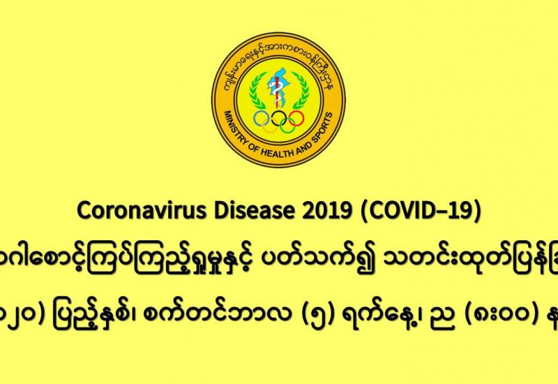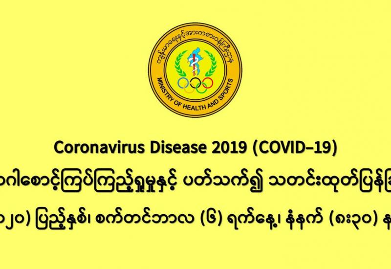 ၁။ (၅-၉ -၂၀၂၀) ရက်နေ့အတွက် COVID-19 ရောဂါ ဓာတ်ခွဲစစ်ဆေးရာတွင် - - အမျိုးသားကျန်းမာရေးဓာတ်ခွဲမှုဆိုင်ရာဌာန (ရန်ကုန်) (NHL) မှ (ဒုတိယအသုတ် ) ဓာတ်ခွဲ နမူနာ (၈၉၇)ခု နှင့် - ဆေးသုတေသနဦးစီးဌာန (DMR)မှ (ဒုတိယအသုတ် ) ဓာတ်ခွဲနမူနာ (၂၀၅) ခု - ပြည်သူ့ကျန်းမာရေးဓာတ်ခွဲမှုဆိုင်ရာဌာန (မန္တလေး) မှ(ဒုတိယအသုတ် ) ဓာတ်ခွဲနမူနာ (၃၅၇) ခု၊ - ပြည်သူ့ဆေးရုံကြီး၊ မြ၀တီမြို့မှ ဓာတ်ခွဲနမူနာ (၁၄) ခု၊ - ပြည်သူ့ဆေးရုံကြီး၊ တောင်ငူမြို့မှ ဓာတ်ခွဲနမူနာ (၁) ခု နှင့် - စုစုပေါင်း (၁,၄၇၄)ခု အား စစ်ဆေးပြီးစီးခဲ့ရာ - • COVID-19 ရောဂါ ဓာတ်ခွဲအတည်ပြုလူနာသစ် (၆၆) ဦး တွေ့ရှိရပါသည်။
