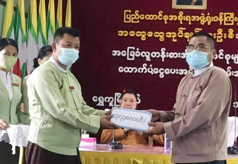 ပဲခူးတိုင်းဒေသကြီးအစိုးရအဖွဲ့ဝန်ကြီးချုပ် ဦးဝင်းသိန်း၊ တောင်ငူခရိုင် အုပ်ချုပ်ရေးမှူး ဦးမိုးထက်နှင့် တာဝန်ရှိသူများ သည် ရေတာရှည်မြို့၊ အ.ထ.က၊ အောင်ဆန်းခန်းမ၌ ကျင်းပပြုလုပ်သော မူလွန်-စိမ့်ရွာကျောင်းဆောင် အပြီးသတ် ဆောက်လုပ်နိုင်ရေးနှင့် ကျေးရွာမီးလင်းရေး အတွက် အလှူငွေများ ပေးအပ်ပွဲသို့ တက်ရောက်ခဲ့သည်။