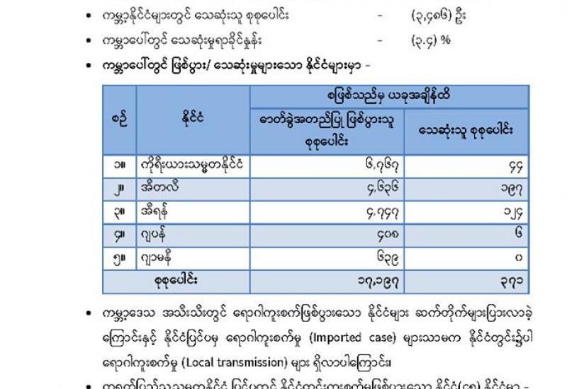 လတ်တလော အသက်ရှူလမ်းကြောင်းဆိုင်ရာရောဂါ (COVID-19) နှင့် စပ်လျဉ်း၍ ကမ္ဘာ တစ်ဝန်း ရောဂါကူးစက်ဖြစ်ပွားသည့် နိုင်ငံများ တစ်နိုင်ငံပြီး တစ်နိုင်ငံဆိုသလို ဆက်တိုက် များပြားလာနေသည်။ နိုင်ငံပြင်ပမှ ရောဂါကူးစက်ဝင်ရောက်လာခြင်း၊ နိုင်ငံအတွင်း၌လည်း ဆက်လက် ကူးစက်ပြန့်ပွားခြင်း နည်းလမ်းများဖြင့် ရောဂါကူးစက်ပြန့်ပွားမှု အခြေအနေများ ဖြစ်ပေါ်နေရာ ကမ္ဘာ့ကျန်းမာရေး အဖွဲ့ကြီးက ကူးစက်ပြန့်ပွားနိုင်မှု (Risk Assessment) အလွန်မြင့်မားသည့် အဆင့် (Very High) အဖြစ် တိုးမြှင့်သတ်မှတ်ထားပြီဖြစ်သည်။