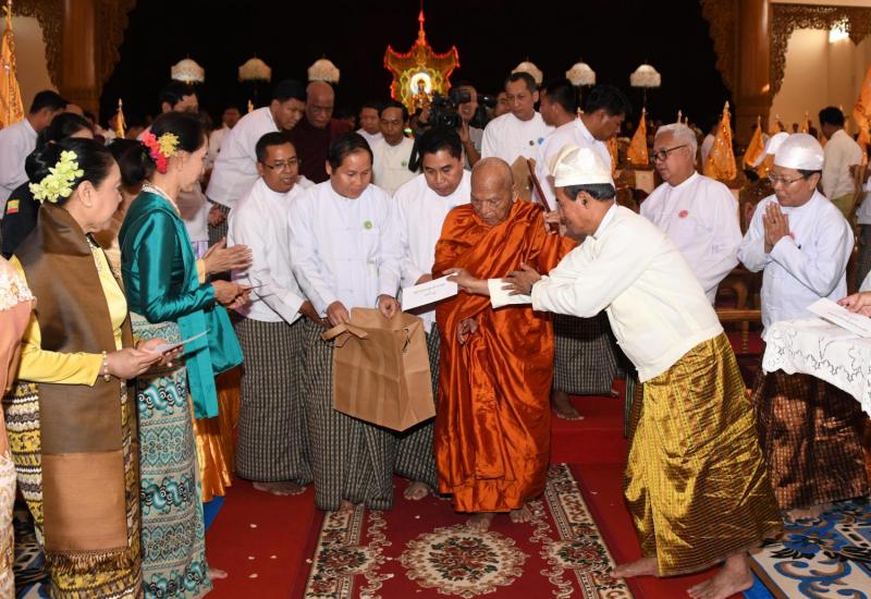 ၂၀၂၀ ပြည့်နှစ် သာသနာတော်ဆိုင်ရာ ဘွဲ့တံဆိပ်တော်များ ဆက်ကပ်ပူဇော်ပွဲ မဟာမင်္ဂလာ အခမ်းအနားကို ယနေ့မွန်းလွဲ ၁ နာရီတွင် နေပြည်တော် ဥပ္ပါတသန္တိစေတီတော်ပရိဝုဏ်အတွင်းရှိ သာသနာ့မဟာဗိမာန်တော်ကြီး၌ ကျင်းပရာ နိုင်ငံတော် သမ္မတ ဦးဝင်းမြင့်နှင့်ဇနီး ဒေါ်ချိုချို၊ နိုင်ငံတော်၏အတိုင် ပင်ခံပုဂ္ဂိုလ် ဒေါ်အောင်ဆန်းစုကြည် တို့ တက်ရောက်ကြည်ညို၍ သာသနာတော်ဆိုင်ရာ ဘွဲ့တံဆိပ် တော်များဆက်ကပ်ပူဇော်ကြသည်။