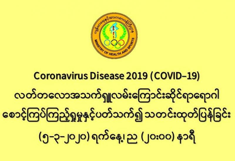 ၁။ ကျန်းမာရေးနှင့်အားကစားဝန်ကြီးဌာနသည် တရုတ်ပြည်သူ့သမ္မတနိုင်ငံအပါအဝင် ကမ္ဘာ့နိုင်ငံ (၇၇) နိုင်ငံတွင် ကူးစက်ပျံ့နှံ့လျက်ရှိသည့် COVID-19 လတ်တလောအသက်ရှူလမ်းကြောင်းဆိုင်ရာ ရောဂါဖြစ်ပွားမှုဖြစ်စဉ်နှင့်ပတ်သက်၍ ရောဂါစောင့်ကြပ်ကြည့်ရှုခြင်း လုပ်ငန်းများအား အပြည်ပြည် ဆိုင်ရာ ဝင်ပေါက်၊ ထွက်ပေါက်ဂိတ်များတွင်လည်းကောင်း၊ ဆေးရုံအခြေပြုအဖြစ်လည်းကောင်း၊ ပြည်သူ လူထုအခြေပြု စောင့်ကြပ်ကြည့်ရှုခြင်းလုပ်ငန်းများဖြင့်လည်းကောင်း၊ ပုဂ္ဂလိကဆေးရုံများ နှင့် ပူးပေါင်း၍လည်းကောင်း ဆောင်ရွက်လျက်ရှိပါသည်။